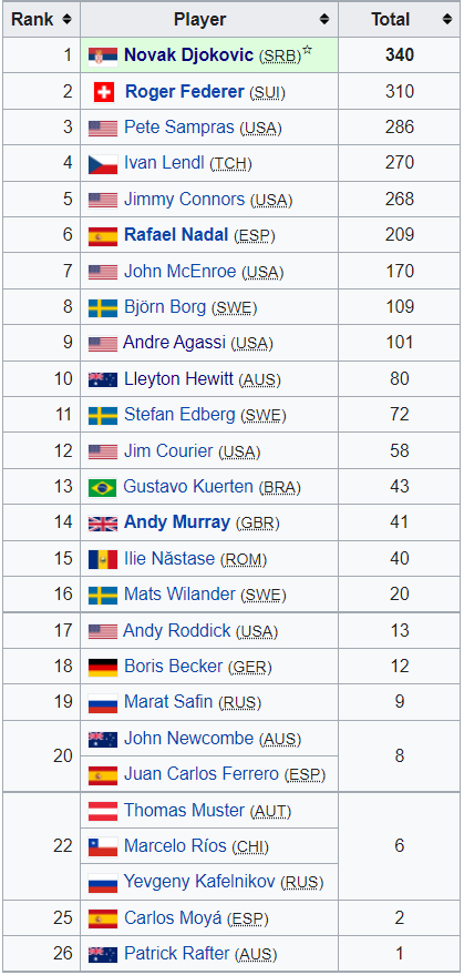 Pred nama je lista svih igrača na ovom svetu koji su u jednom momentu bili najbolji na svetu. Toj listi se u prethodnih 10 godina dopisao samo jedan igrač. To je bio Endi Marej 2016. godine. Tamo nije lako doći, a mnogo teže je ostati. To svedoči i dno ove tabele gde su neki igrači bili prvi jedva par nedelja i tamo je pre 30 nedelja na prvo mesto došao Novak. Njegova luda brojka od 340 nedelja veća je od zbira poslednjih 13 igrača sa ove liste.