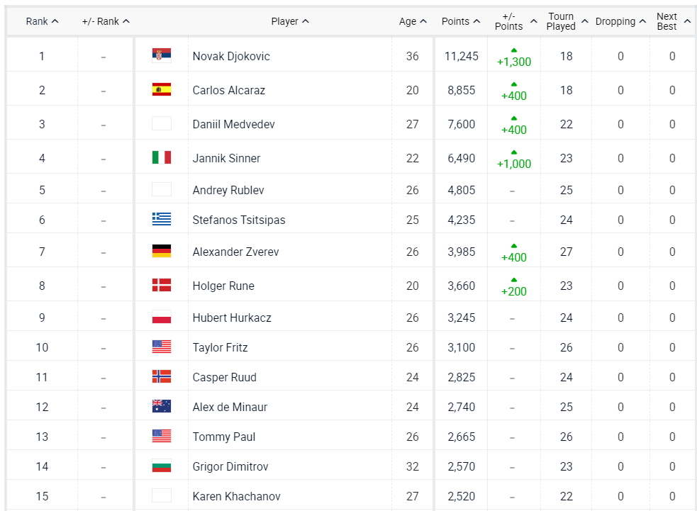 Posle maestralnog trijumfa u Torinu i pobede nad Janikom Sinerom, Novak na novoj ATP listi ima 11.245 poena. Njegova razlika nad Karlosom Alkarasom je na kraju ove sezone 2.390 poena, a na trećem i četvrtom mestu završavaju Danil Medvedev sa 7.600 odnosno 6.490 poena. Listu pet najboljih zaključuje Andrej Rubljov sa 4.805 poena.