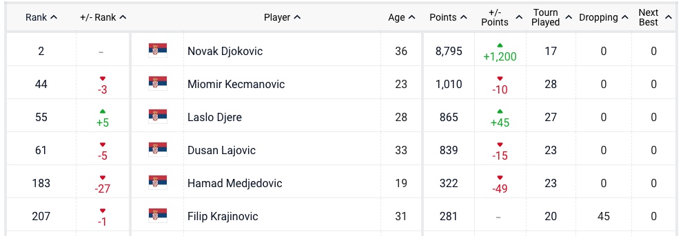 Što se srpskih tenisera tiče, Miomir Kecmanović je 44. posle pada za tri mesta, a Laslo Đere je popravio plasman za pet pozicija i ove sedmice je 55. igrač planete.