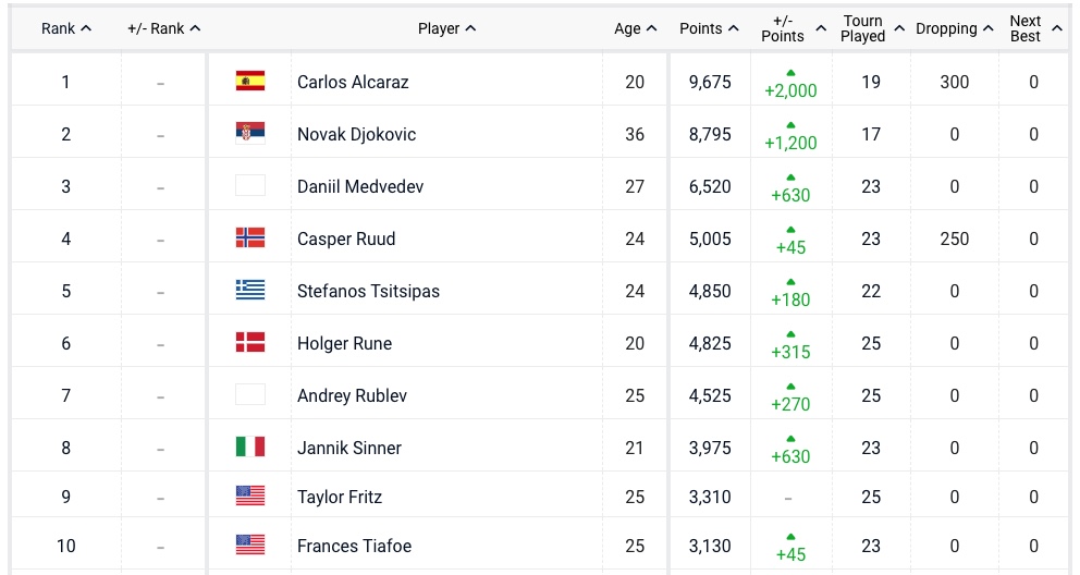 U TOP 10 nije bilo promena – Španca i Srbina prate Danil Medvedev, Kasper Rud, Stefanos Cicipas. Šesti je Holer Rune, zatim Andrej Rubljov, iza njega Janik Siner, a najbolju desetorku zatvaraju Amerikanci Tejlor Fric i Frensis Tijafo.