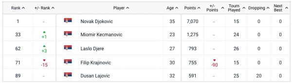 Drugi reket Srbije, Miomir Kecmanović, napredovao je za jedno mesto i sada je 33. na rang listi. Laslo Đere je napravio tri koraka unapred i ove sedmice je 62, a Filip Krajinović pao je za čak 15 mesta, pa se na najnovijoj rang listi nalazi na 71.poziciji.