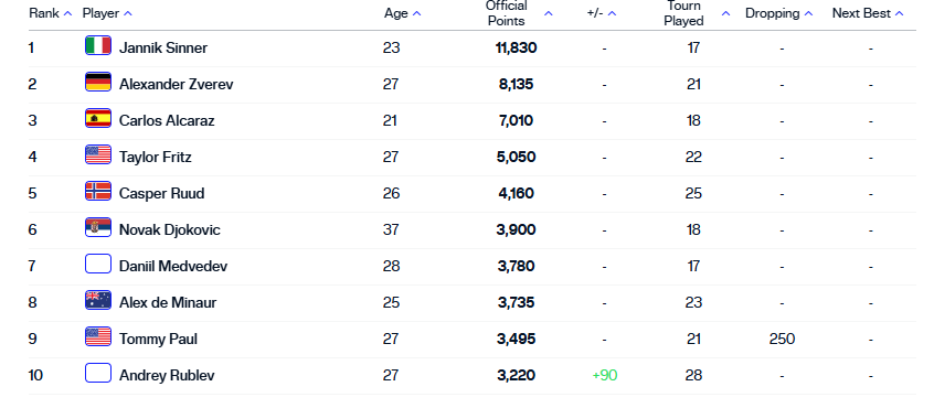 Janik Siner prvi je sa 11.830 bodova, dok je drugi Aleksander Zverev sa 8.135 bodova.