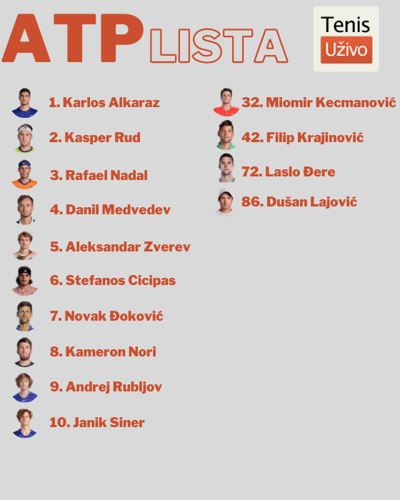 Ispred njega su Karlos Alkaraz, Kasper Rud, Rafel Nadal, Danil Medvedev, Aleksandar Zverev, Stefanos Cicipas, Novak Đoković, Kameron Nori i Andrej Rubljov.