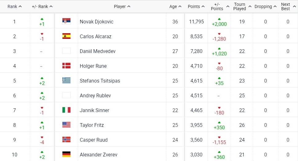 Treće mesto i dalje drži Danil Medvedev koji je plasmanom u finale dobio novih 1.020. bodova, dok je četvrti Rune. Stefanos Cicipas je napredovao za dve pozicije pa je sada peti, a za njim slede Rubljov, Siner, Tejlor Fric i Kasper Rud. U top 10 tenisera sveta našao se i Aleksandar Zverev koji je sa tog mesta zbacio Amerikanca Tijafoa.