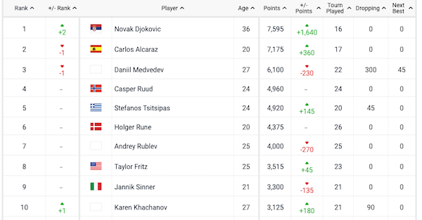 Naredna mesta ostala su nepromenjena i na njima se nalaze Kasper Rud, Stefanos Cicipas, Holger Rune, Andrej Rubljov, Tejlor Fric i Janik Siner.