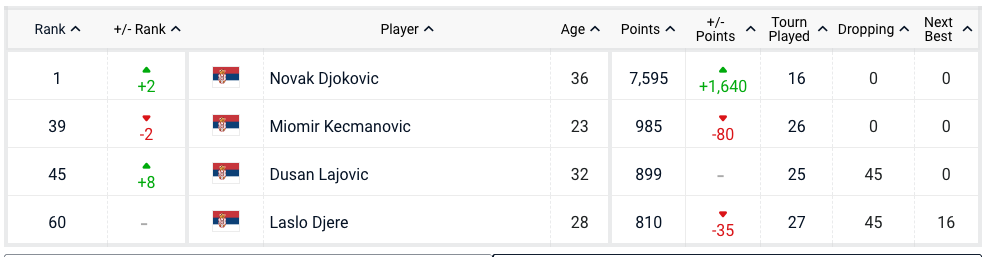 Miomir Kecmanović otišao je dva koraka nazad i zauzeo 39. poziciju, dok je Dušan Lajović napredovao za osam mesta i ovog ponedeljka je 45. na listi. Laslo Đere zadržao se na 60. mestu. Filip Krajinović ispao je iz TOP 100 i nalazi se na 105. mestu.