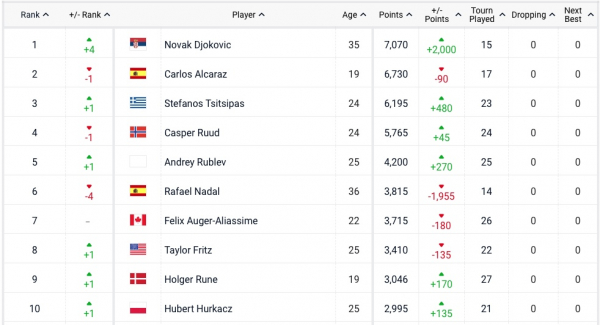 Sa 340 poena manje iza njega je Španac Karlos Alkaraz, a treće mesto zauzima Stefanos Cicipas iz Grčke. Prate ih Kasper Rud, Andrej Rubljov, Rafael Nadal, Feliks Ože-Alijasim, Holger Rune i Hubert Hurkač.