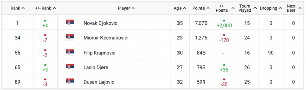 Što se srpskih tenisera tiče, drugi reket naše zemlje, Miomir Kecmanović, pokvario je plasman na rang listi za čak sedam pozicija i ove nedelje je na mestu 34. Filip Krajinović je sa 54. pao na 56. poziciju, a Laslo Đere je posle tri koraka unapred 65. igrač planete. Dušan Lajović otišao je tri mesta unazad i ove sedmice svetski je broj 89.