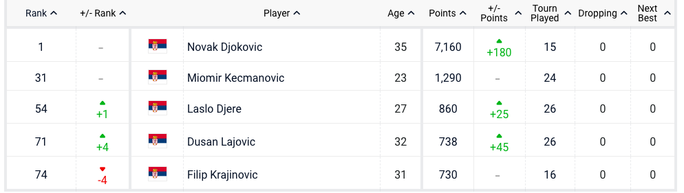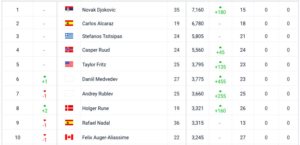 Sada ima 7.160 bodova bodova, dok je na drugom mestu Karlos Alkaraz sa 6.780 bodova. Slede Stefanos Cicipas, Kasper Rud i Tejlor Fric.