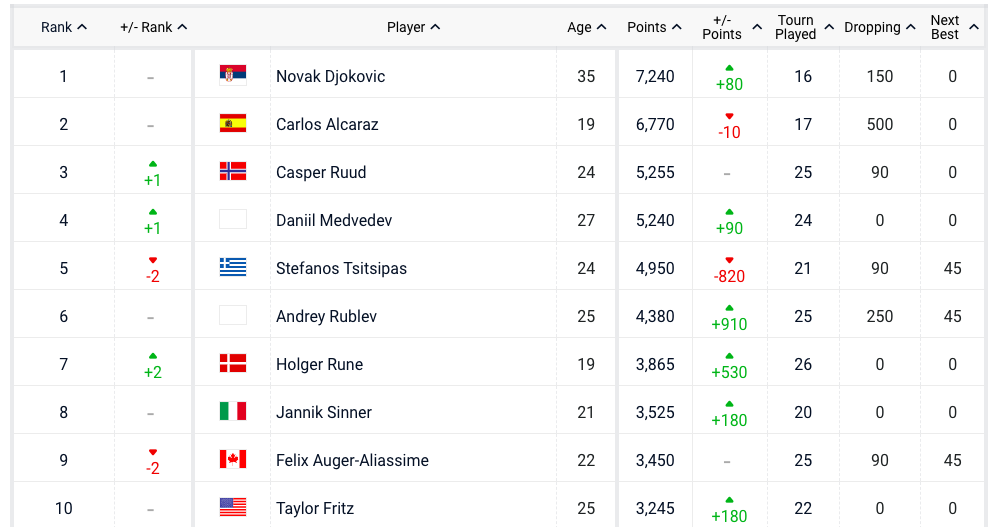 Stefanos Cicipas je, uz dva koraka nazad, peti na svetu. Šampion Monte Karla Andrej Rubljov je, bez promene, šesti, dok je njegov protivnk u finalu Holger Rune imao napredak za dve pozicije i zauzeo sedmo mesto, što mu najbolji rang u karijeri.