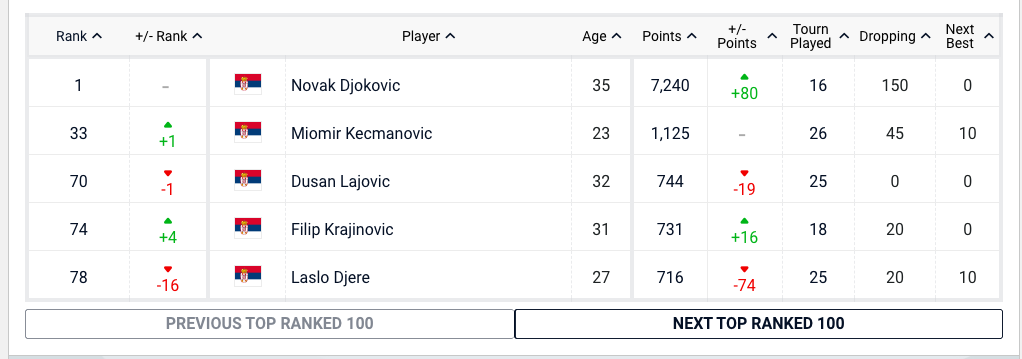 Miomir Kecmanović je 33. na planeti (+1), Dušan Lajović 70. (+1), Filip Krajinović 74. (+4), a Laslo Đere je imao pad od 16. mesta i sada je 78. na listi.