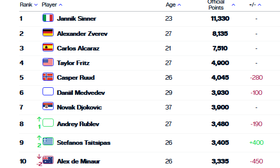 Jedan korak napred otišao je Andrej Rubljov i zauzeo osmo mesto, dok je iza njega Stefanos Cicipas, uz dva mesta napred. Deseti na planeti je Aleks De Minor koji je ove nedelje pao za dve pozicije.