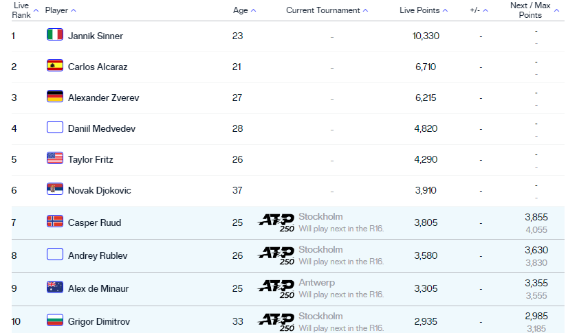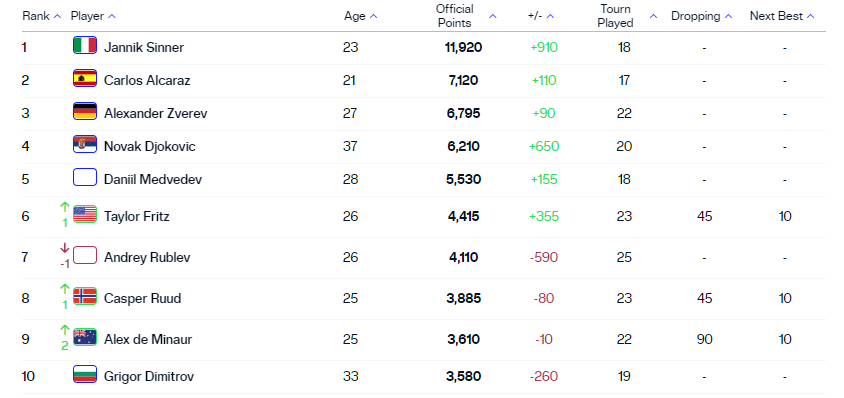Novom titulom, Janik Siner je obezbedio već sada prvo mesto na kraju sezone. Drugi je Alkaras, treći Zverev a peti Medvedev.