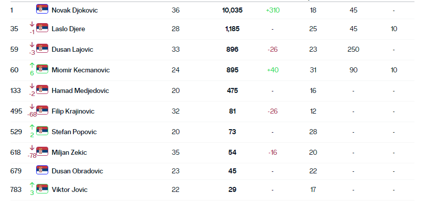 Kada su u pitanju srpski teniseri, Laslo Đere beleži pad za jedno mesto, sada je 35. sa 1.185 bodova. Dušan Lajović je sa 56. pao na 59. mesto i ima 896 bodova, a iza njega je Miomir Kecmanović koji ima bod manje, ali je napravio skok za šest pozicija.