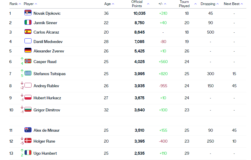 Ono što je izvesno – Đokoviću su garantovane još četiri nedelje na prvom mestu. Ima 10.035 bodova, a Siner 8.750. Do kraja sezone na šljaci, Srbin brani još 2.225 bodova, a Siner 225, tako da će praktično od rezultata na Rolan Garosu zavisiti ko će na Vimbldon doći kao svetski broj jedan.