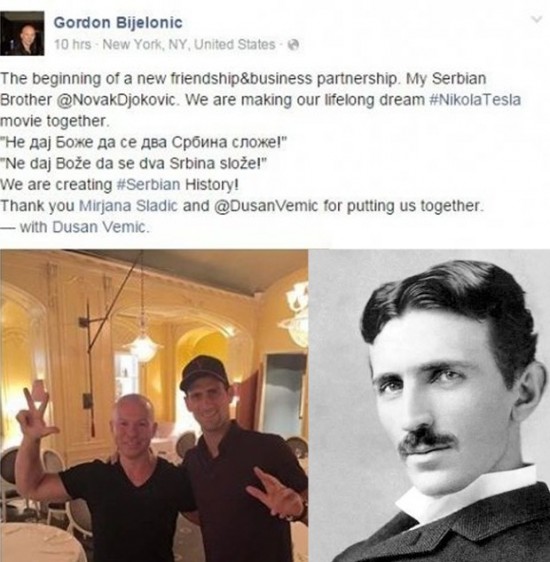 Najbolji teniser sveta Novak Đoković u saradnji sa holivudskim producentom Gordonom Bijelonićem trebalo bi da bude deo projekta snimanja filma o velikom naučniku i srpskom geniju, Nikoli Tesli.