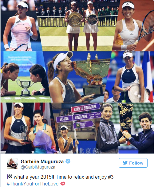 Nakon sjajne 2015. godine i fantastičnih rezultata Španjolka, Garbinje Muguruza, završila je tekuću sezonu na visokoj trećoj poziciji! Ona je ovim plasmanom postala prva Španjolka kojoj je uspelo da završi sezonu u Top 3, još od 1996. godine, kada je Aranča Sančez završila sezonu među najboljima.