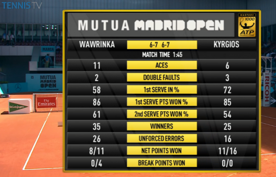 U drugom kolu Mastersa u Madridu, Nik Kirjos je eliminisao četvrtog nosioca Stanislasa Vavrinku pobedom od 7:6 (7), 7:6 (2).