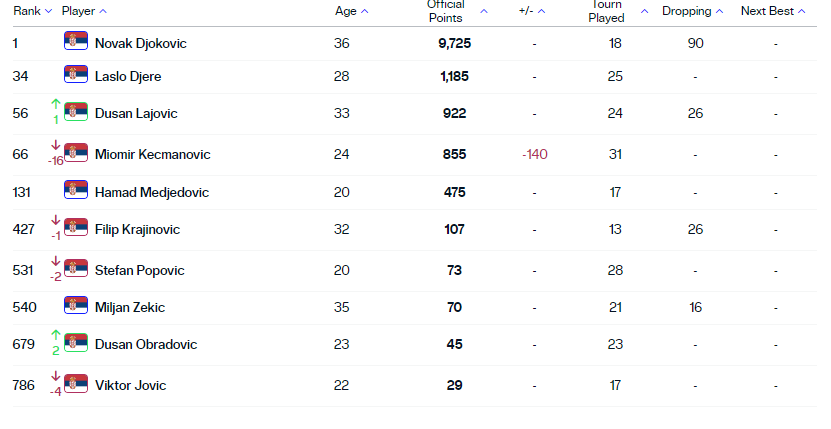 Što se preostalih naših igrača tiče, Laslo Đere je ostao na 34. mestu, Miomir Kecmanović je pao za 16 pozicija i sada je 66, a Dušan Lajović je deset mesta bolje plasiran. Hamad Međedović je na 131. mestu.