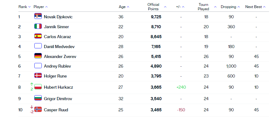 Đoković ima 9.725 bodova, a iza njega je Janik Siner sa 8.710. Na trećem mestu je Karlos Alkaraz sa 8.645 bodova, a najveća promena u top 10 je proboj Huberta Hurkača na desetu poziciju, posle titule u Eštorilu. Posle trofeja u Hjustonu, Ben Šelton ima rang karijere na 14. poziciji.