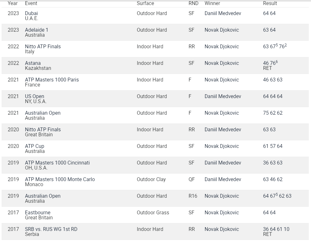 Na gren slemovima se nisu sastajali od čuvene noći na Flešing Medouzu. Srbin je prošle godine pobedio u Astani i Torinu, početkom ove u Adelaidu, ali je Rus slavio na poslednjem meču, u polufinalu Dubaija.