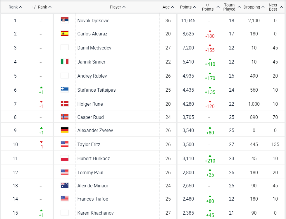 Turniri u Beču, koji je osvojio Siner, i u Bazelu, koji je osvojio Ože-Alijasim, doneli su nam nekoliko promena u top 10. Tačnije, dve rokade – Cicipas je šesti a Rune sedmi, dok je Zverev na devetom, a Fric na desetom mestu.