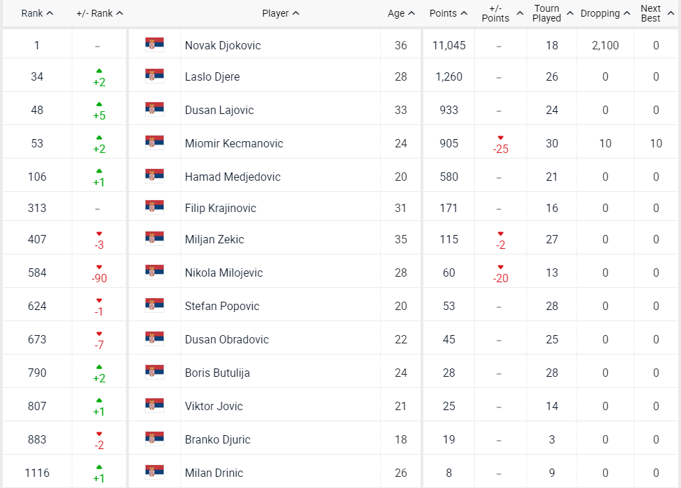 Od preostalih srpskih tenisera. Laslo Đere je na 34. mestu (1.260), Dušan Lajović je 48. (933), dok je Miomir Kecmanović 53. sa 905 poena. Izvan Top 100 je ostao Hamad Međedović sa 580 bodova.