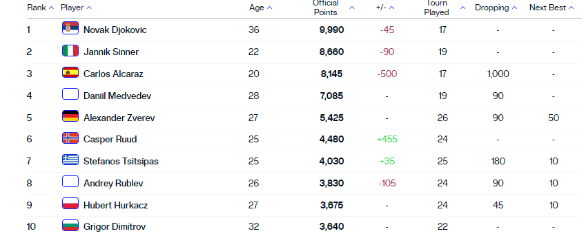 Danil Medvedev se nalazi na četvrtom mestu sa 7.085 poena, Aleksander Zverev je peti sa 5.425 bodova.