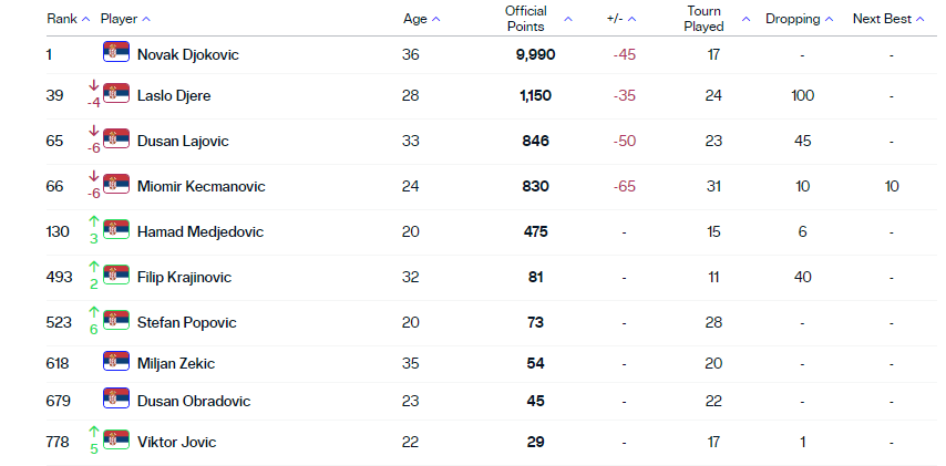 Laslo Đere beleži pad sa 35. na 39. mesto i ima 1.150 bodova.