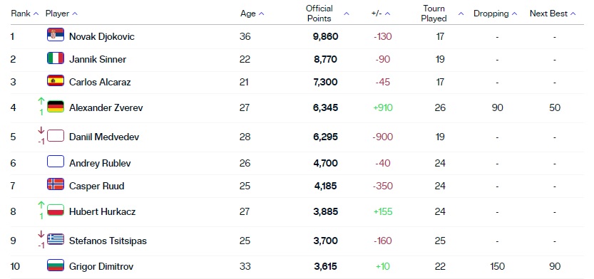 Top deset zatvara Grigor Dimitrov iz Bugarske sa 3.615 poena.