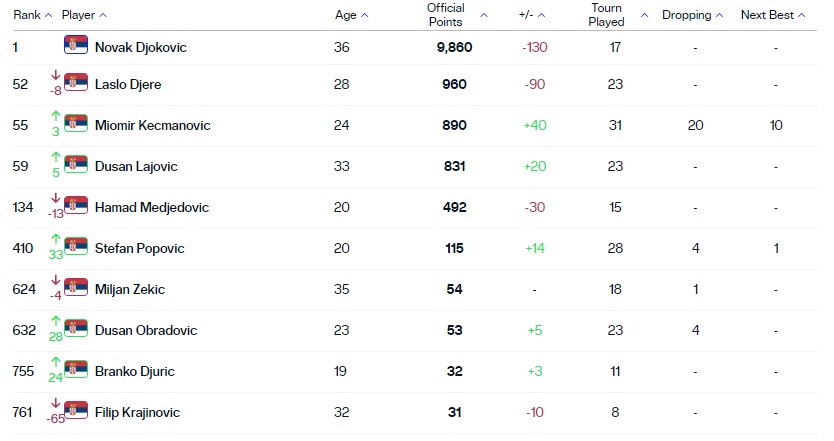 Što se tiče ostalih srpskih tenisera, Laslo Đere je pao za osam pozicija i sada je 52. sa 960. bodova. Miomir Kecmanović je napredovao za tri mesta i 55. je sa 890 poena, a Dušan Lajović je takođe popravio svoj plasman. Sa 64. skočio je na 59. mesto i ima 831 bod.