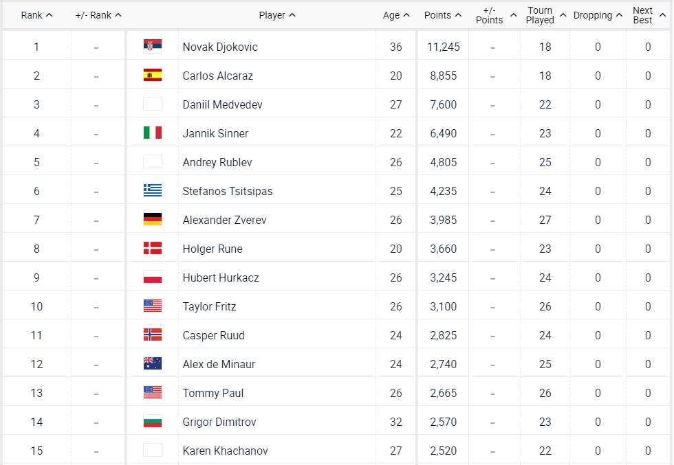 Izvesno je da će najbolji i najveći svih vremena biti nedodrljiv na vrhu još najmanje sedam nedelja. Siguran je na čelu karavana sa 11.245 poena, ispred Alkarasa, Medvedeva, Sinera, Rubljova, Cicipasa, Zvereva, Runea, Hurkača i Frica. To je poredak Top 10 tenisera ovog ponedeljka.