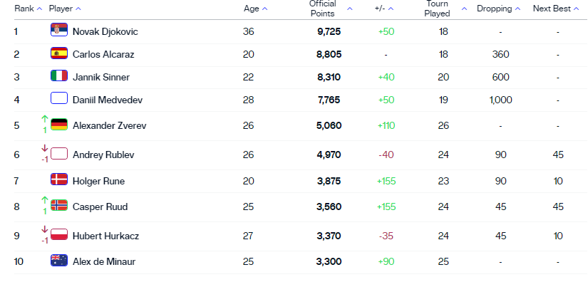 Novak trenuto ima 9.725 bodova ispred drugoplasiranog Španca Karlosa Alkarasa (8.805).