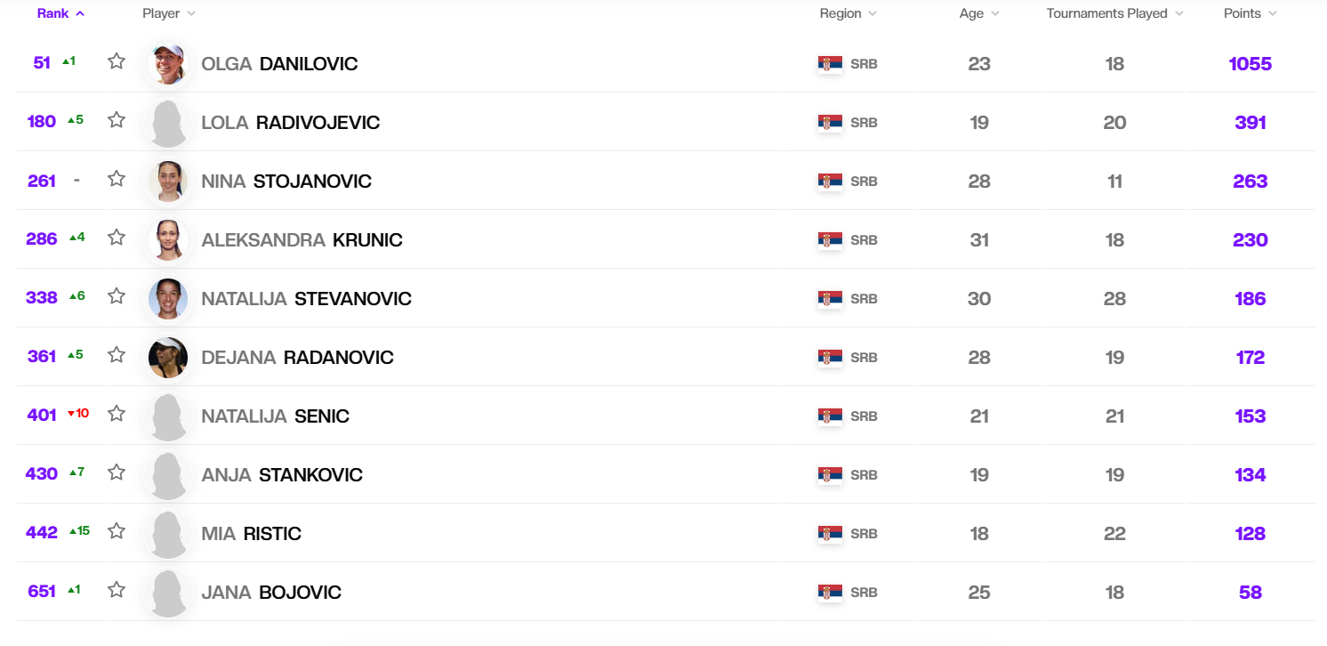 Teme:   Aleksandra Krunić, Darija Kasatkina, Koko Gof, Lola Radivojević, Nina Stojanović, Olga Danilović, Rang Lista, Teniserke, WTA, WTA Rang Lista