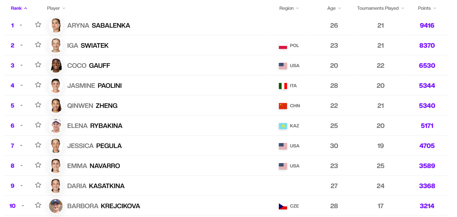 Potom slede Elena Ribakina iz Kazahstana, Amerikanke Džesika Pegula i Ema Navaro, Ruskinja Darija Kasatkina i Čehinja Barbora Krejčikova.