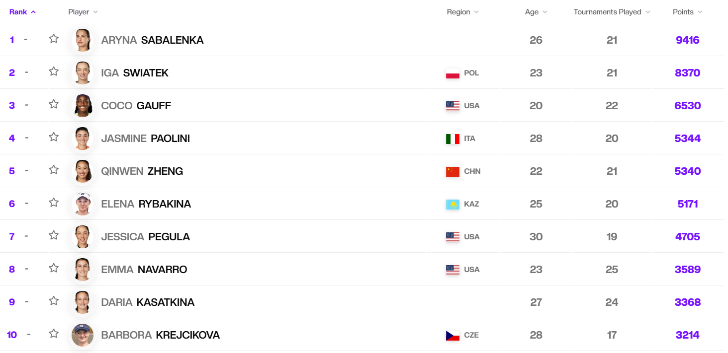 U Top 10 najboljih teniserki sveta nije bilo promena. Beloruskinja Arina Sabalenka je prva sa 9.416 bodova, dok je Poljakinja Iga Švjontek druga sa 8.370.
