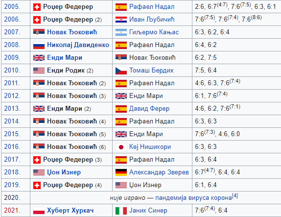 Šta uočavamo iz gore navedene tabele? Više puta upisana ista imena, iste zastave, praktično kao po šablonu. Nije samo Majami u pitanju. U pitanju je 90% najvećih turnira. Veoma mlad, Janik Siner domogao se prvog Masters finala, sa samo 19 godina. To je veoma značajan rezultat i samo je pitanje kako će nastaviti dalje. A gde je u tim godinama bila velika trojka?