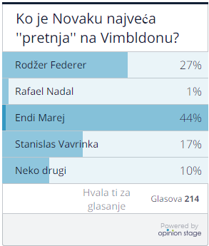 U proteklih nekoliko dana mogli ste na našem sajtu da glasate ko će od tenisera biti najveća pretnja Novaku Đokoviću u pohodu na svoj treći Vimbldon. U ponudi su bili Endi Marej, Rodžer Federer, Rafael Nadal, Sten Vavrinka ili neko od ostalih, a kao navećeg protivnika našeg tenisera odabrali ste tenisera iz Škotske, sa čak 44% vaših glasova.