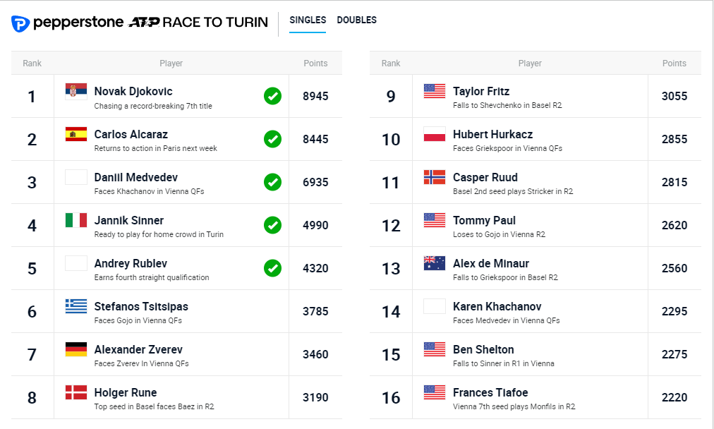 Čak mu ni polufinale ne garantuje završni masters. Uz njega, za preostala tri mesta boriće se Stefanos Cicipas, Aleksander Zverev, Holger Rune, Tejlor Fric, Hubert Hurkač, Aleks De Minor, Tomi Pol.