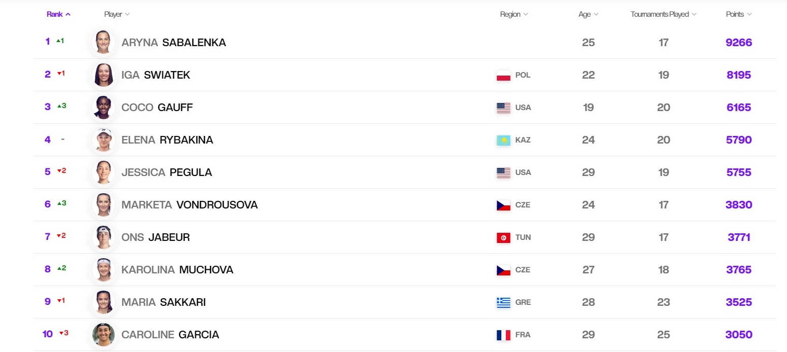Osvajačica titule u Njujorku Koko Gof trenutno se nalazi na trećoj poziciji, a za njom slede Elena Ribakina i Džesika Pegula. Vimbldonska šampionka Marketa Vondrusova popravila je svoj ranking i zauzima šestu poziciju. U top 10 teniserki sveta nalaze se Ons Žaber, Karolina Muhova, Maria Sakari i Karolin Garsija.