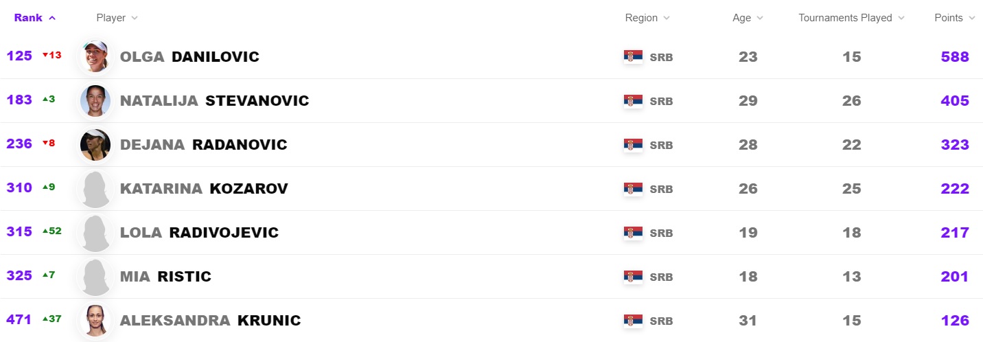 Što se tiče srpskih teniserki, najbolja je i dalje Olga Danilović. Ona je 125. na svetu i pokvarila je plasman za 13 mesta, a ima 588 bodova.