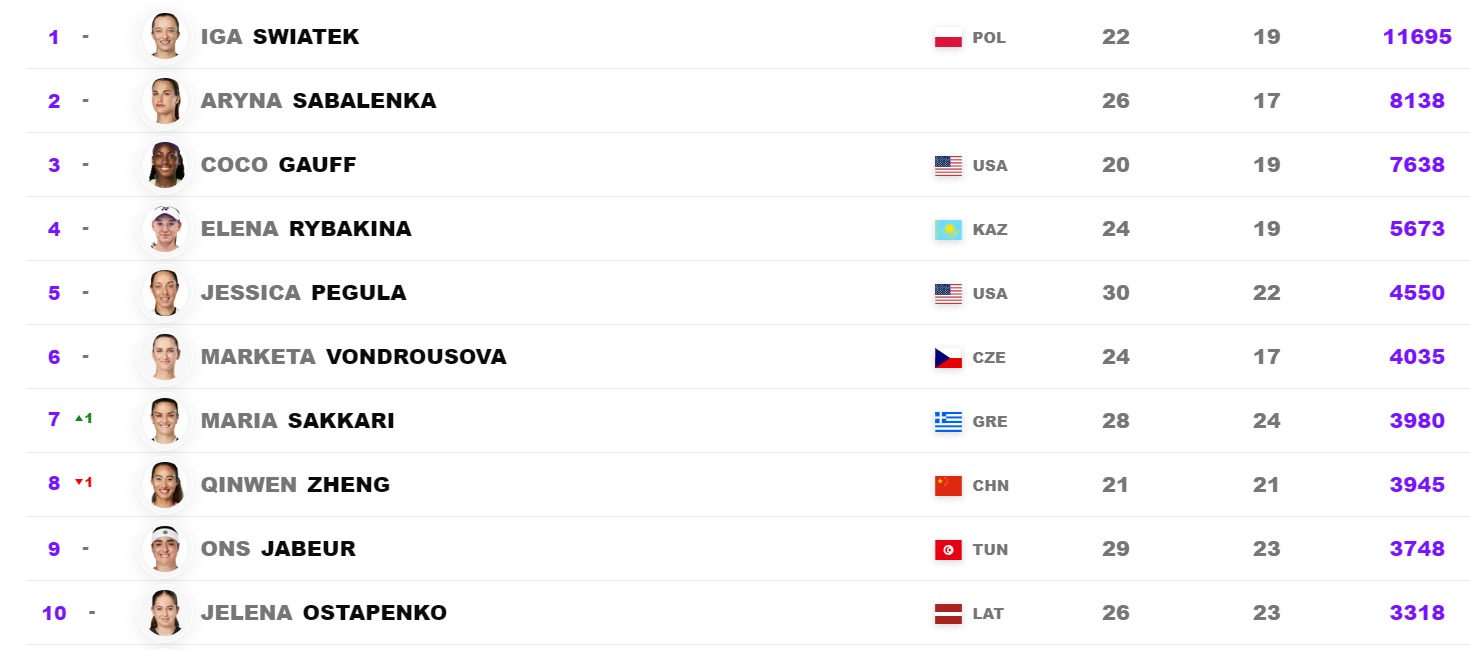 Prate ih Amerikanka Koko Gof (7.638), Elena Ribakina (5.673) koja nastupa pod zastavom Kazahstana, još jedna Amerikanka Džesika Pegula (4.550), a zatim i Čehinja Marketa Vondroušova (4.035). Marija Sakari iz Grčke i Ćinven Ženg iz Kine zamenile su pozicije, pa su sada na sedmom i osmom mestu WTA liste sa 3.980, odnosno 3.945 bodova.