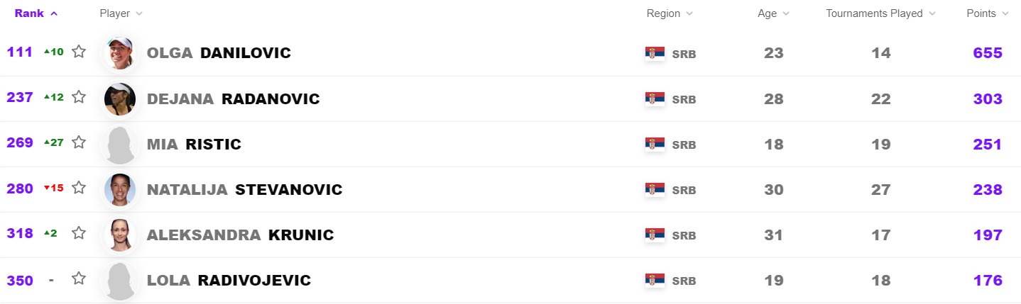 Kada su u pitanju srpske teniserke najbolja je i dalje Olga Danilović. Ona je napredovala za deset pozicija i sada je 111. sa 655 poena.