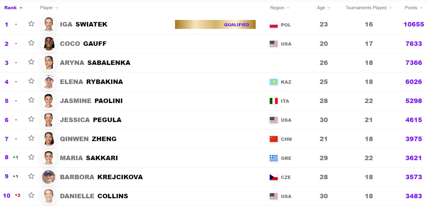 Prate ih Beloruskinja Arina Sabalenka (7.366), Elena Ribakina koja se takmiči pod zastavom Kazahstana (6.026), Italijanka Džasmin Paolini (5.298), Amerikanka Džesika Pegula (4.615) i Kineskinja Ćinven Dženg (3.975).
