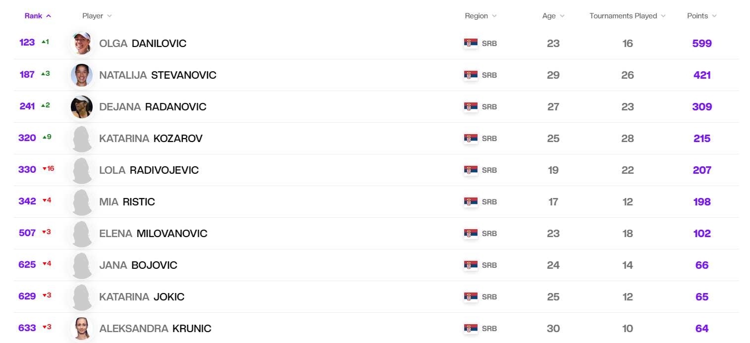Olga Danilović je zabeležila minimalan napredak pa je sada 123. teniserka sveta, dok se Natalija Stevanović pomerila za tri mesta, pa je sada 187. Dejana Radanović je 241. teniserka sveta sa 309 bodova.