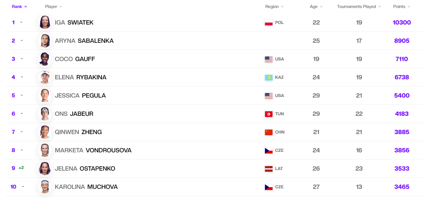 Trećom uzastopnom titulom u Dohi, Iga Švjotnek je zadržala suvereno prvo mesto sa 10.300 bodova, ispred šampionke Australijan opena Arine Sabalenke. Treća je Gof, četvrta Ribakina, a potom slede Pegula, Žaber, Dženg, Vondrušova pa Jelena Ostapenko, koja je napredovala sa 11. na deveto mesto. Top 10 društvo zaorkužuje Karolina Muhova iz Češke.