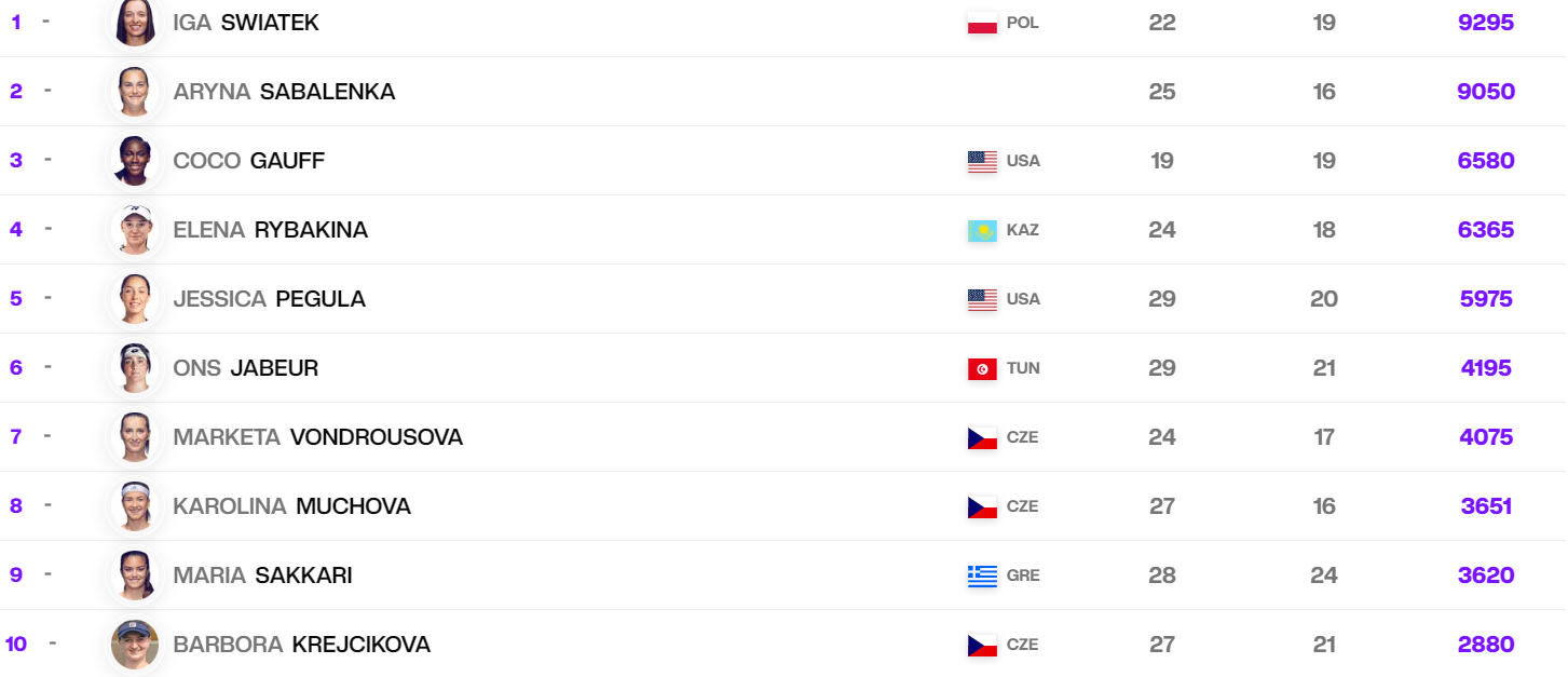U top 10 nije bilo promena – Iga Švjontek je neprikosnovena sa 9.295 bodova, dok je prva iza nje Beloruskinja Arina Sabalenka sa 9.050. Treća je Amerikanka Koko Gof sa 6.580, četvrta Elena Ribakina (Kazahstan) sa 6.365, a peta Amerikanka Džesika Pegula sa 5.975. bodova. U top 10 su još Žabur, Vondrušova, Muhova, Sakari i Krejčikova. Čak tri Čehinje su u top 10.
